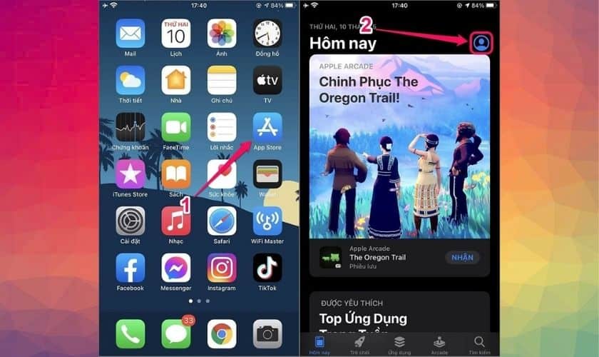 Bước 1: Mở ứng dụng App Store trên iPhone, sau đó nhấn vào biểu tượng tài khoản ở góc trên bên phải màn hình.Mở ứng dụng App Store trên iPhone, sau đó nhấn vào biểu tượng tài khoản ở góc trên bên phải màn hình.