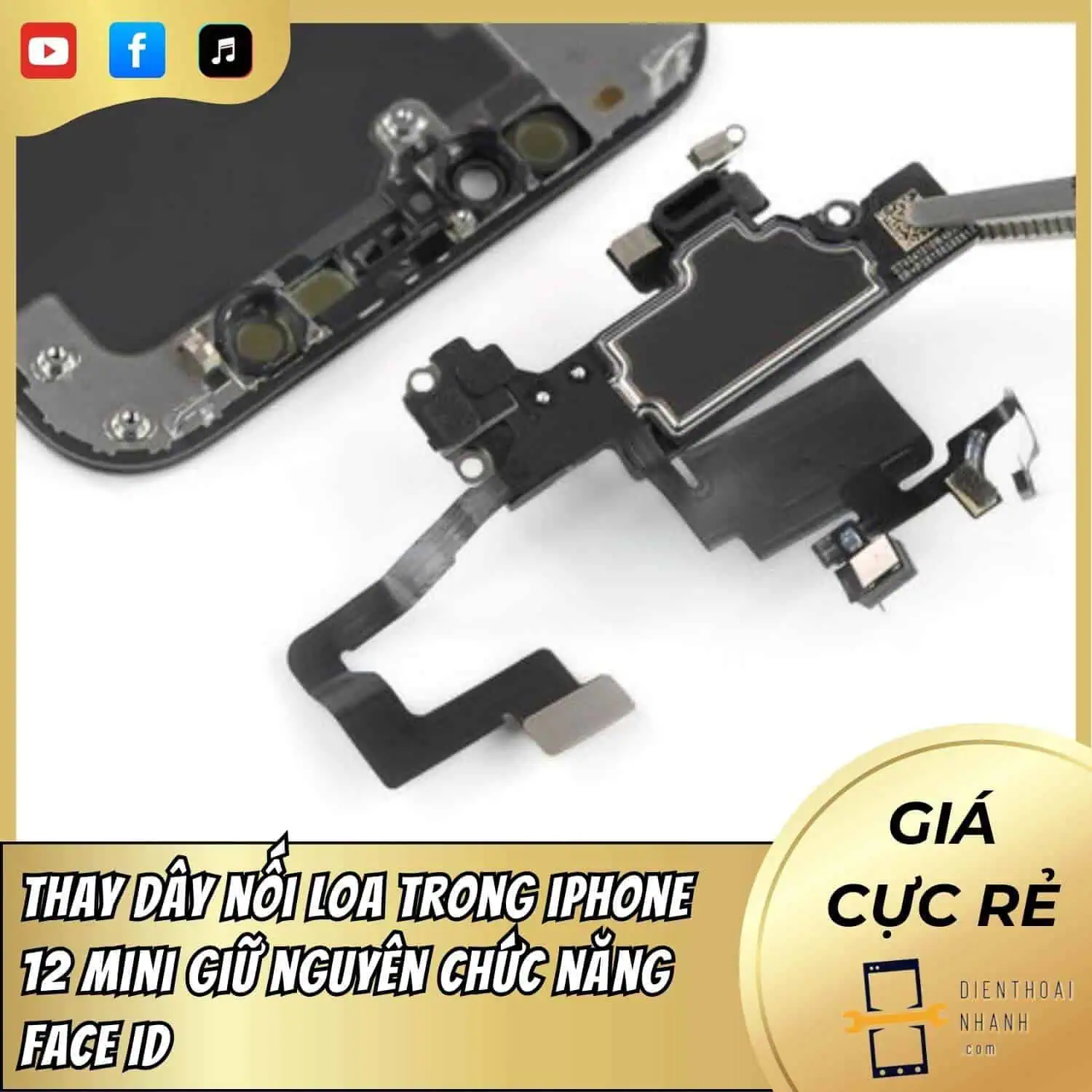Việc thay dây nối loa trong iPhone 12 Mini đòi hỏi quy trình kỹ thuật phức tạp do vị trí linh kiện nằm sát với cụm cảm biến Face ID nhạy cảm. Nếu kỹ thuật viên thiếu kinh nghiệm thao tác không cẩn thận, rất dễ làm mất Face ID vĩnh viễn trong quá trình sửa chữa loa trong.