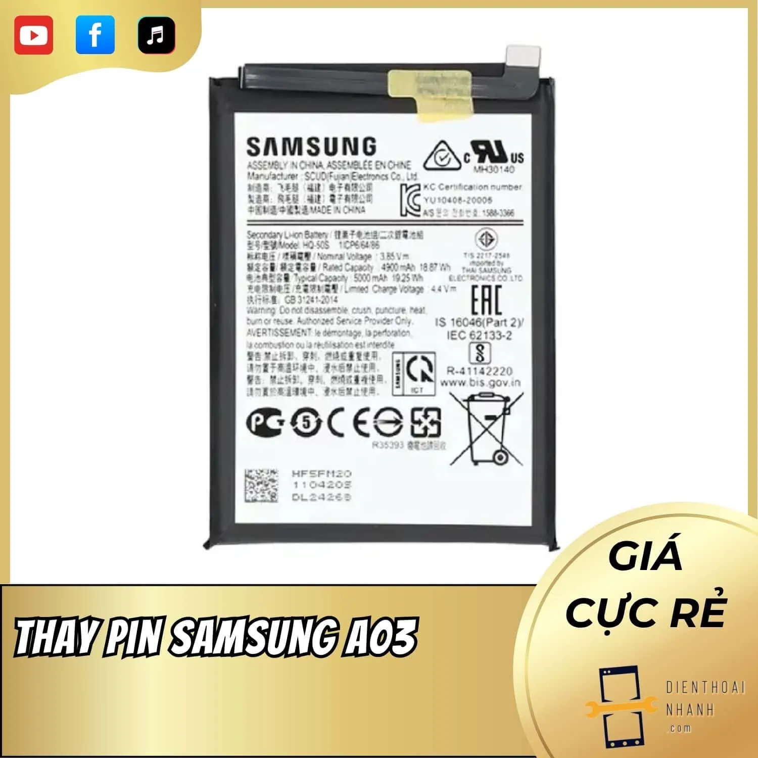 - Pin thay xong có bị nóng không? Trả lời: Hoàn toàn không. Nếu bạn thay pin Samsung A03 bằng pin zin chính hãng hoặc pin linh kiện cao cấp tại Điện Thoại Nhanh, chúng tôi cam kết pin sẽ hoạt động ổn định và không gây ra hiện tượng nóng máy bất thường.