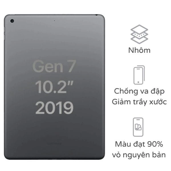 iPad Gen 7 sở hữu độ dày khoảng 7.5 mm, khá mỏng so với nhiều tablet cùng phân khúc. Phần vỏ (mặt lưng và khung sườn) được làm từ nhôm nguyên khối, đem lại cảm giác chắc tay, dễ tản nhiệt và độ bền cao. Mặc dù vậy, chất liệu nhôm vẫn có thể bị trầy xước, móp nếu chịu va chạm mạnh. Apple đã hoàn thiện bề mặt nhôm bằng lớp sơn hoặc anodized, tùy phiên bản màu (Bạc, Xám, Vàng…) để tăng tính thẩm mỹ, hạn chế bong tróc khi sử dụng.